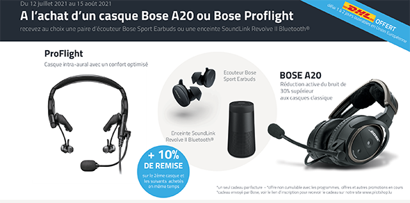 ACHETEZ UN CASQUE BOSE A20 OU UN BOSE PROFLIGHT ET RECEVEZ UNE PAIRE D'OREILLETTES BOSE SPORT EARBUDS ou une enciente SoundLink Revolve II Bluetooth®.