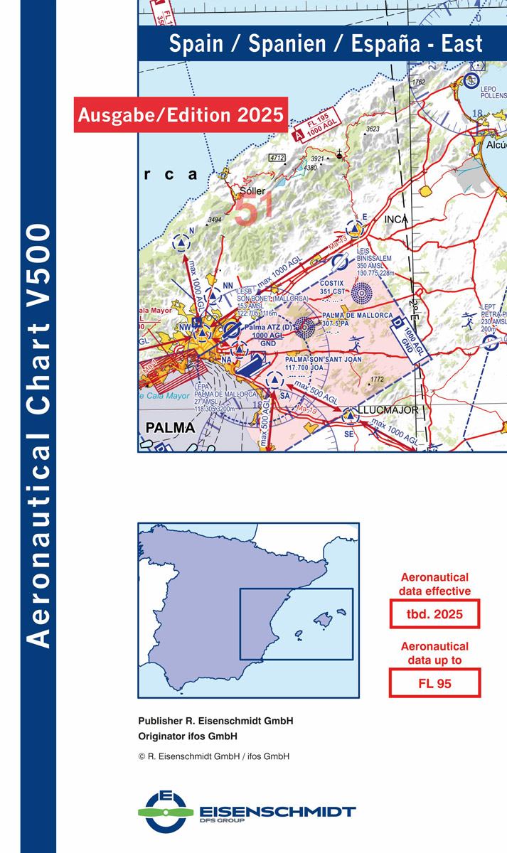La carte aéronautique VFR Visual 500 pour l'Espagne. Elle possède la qualité et la conception des cartes OACI à l'échelle 1/500 000. Cette carte est une aide précieuse pour vos navigations VFR en Europe.
